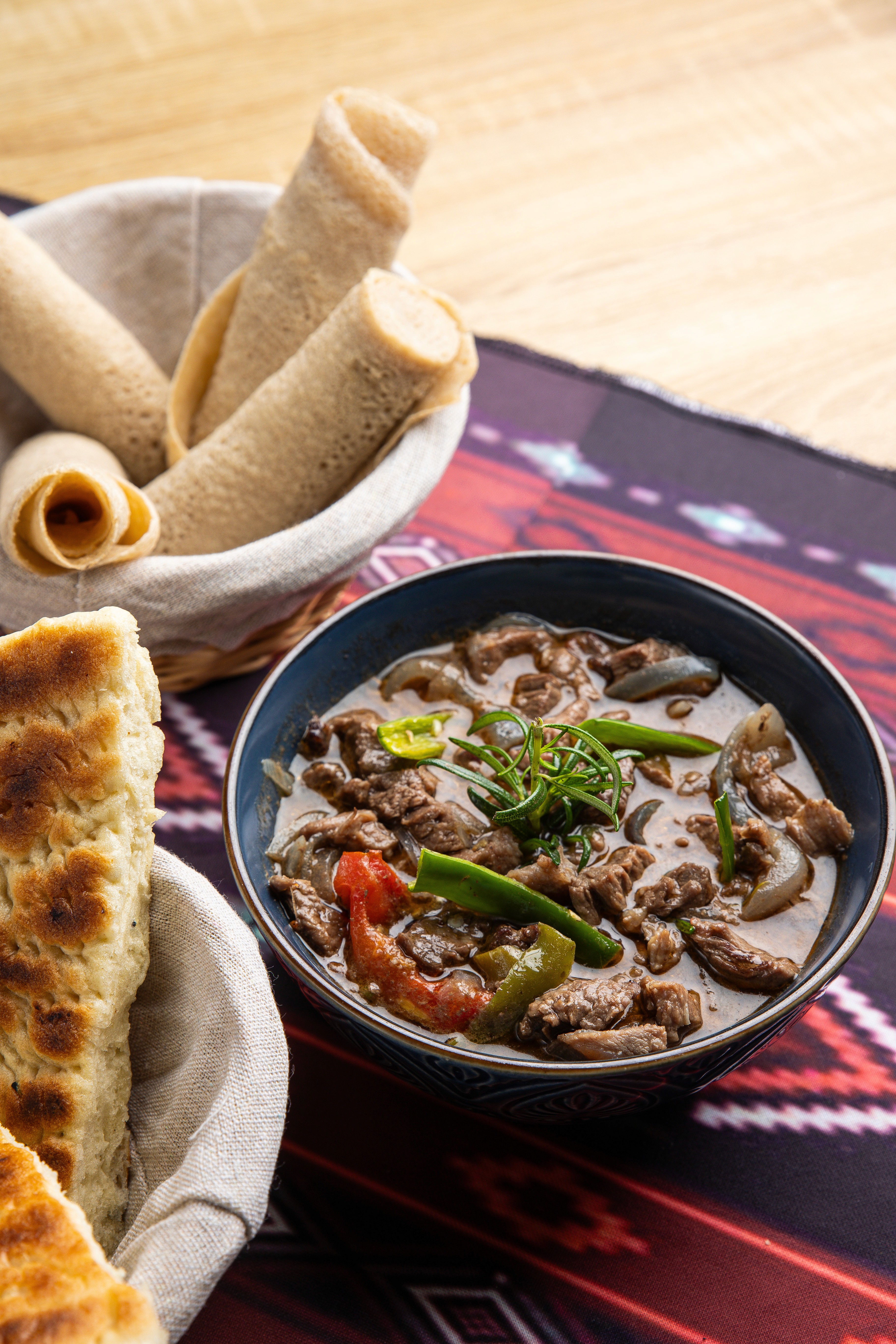 Wołowina długo gotowana w berbere z cebulą, czosnkiem i masłem przyprawionym. Wyrazisty smak etiopski. Podawana z: etiopskim twarogiem (ayib) i Alicha Siga Be Dinch.