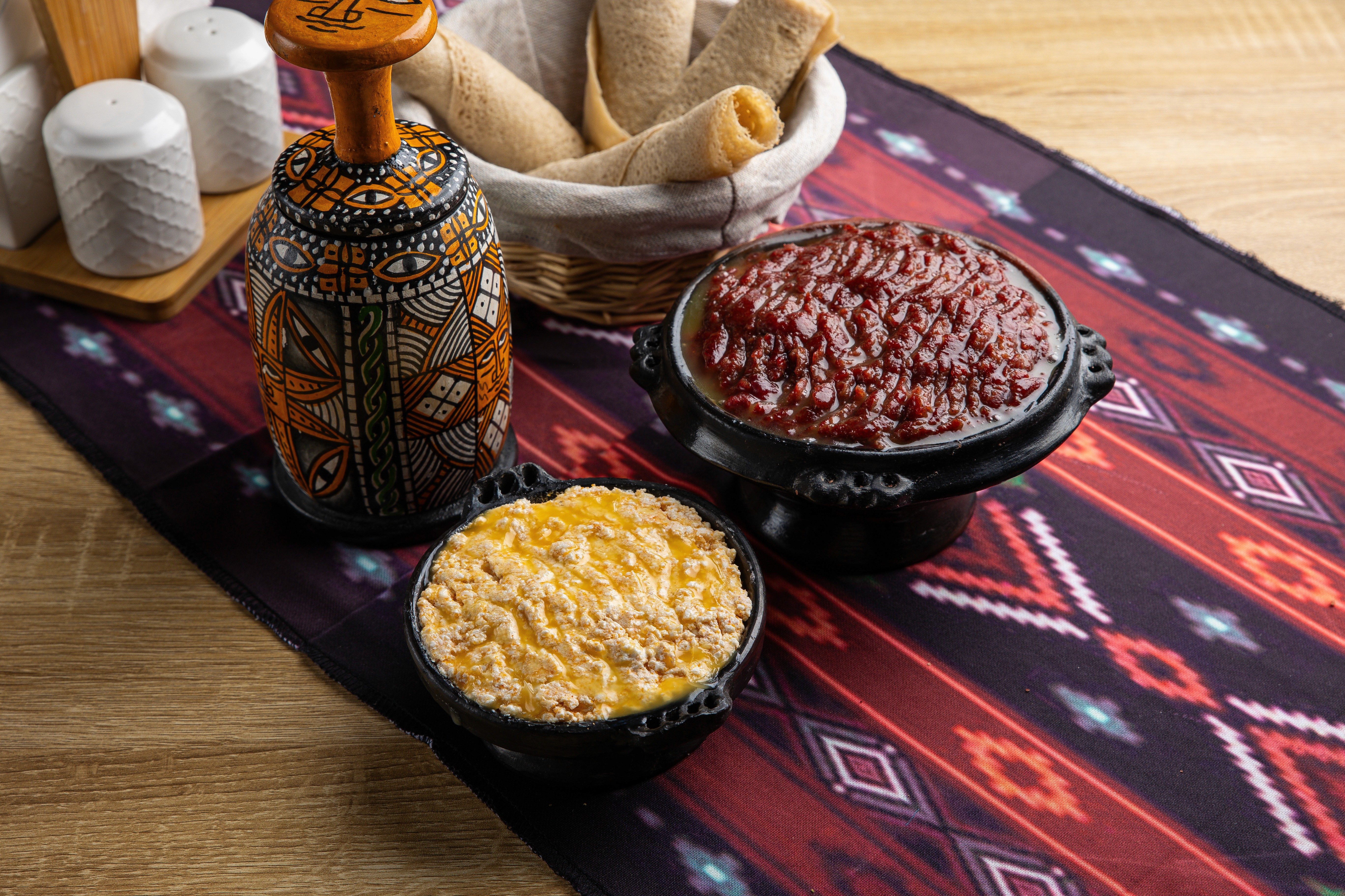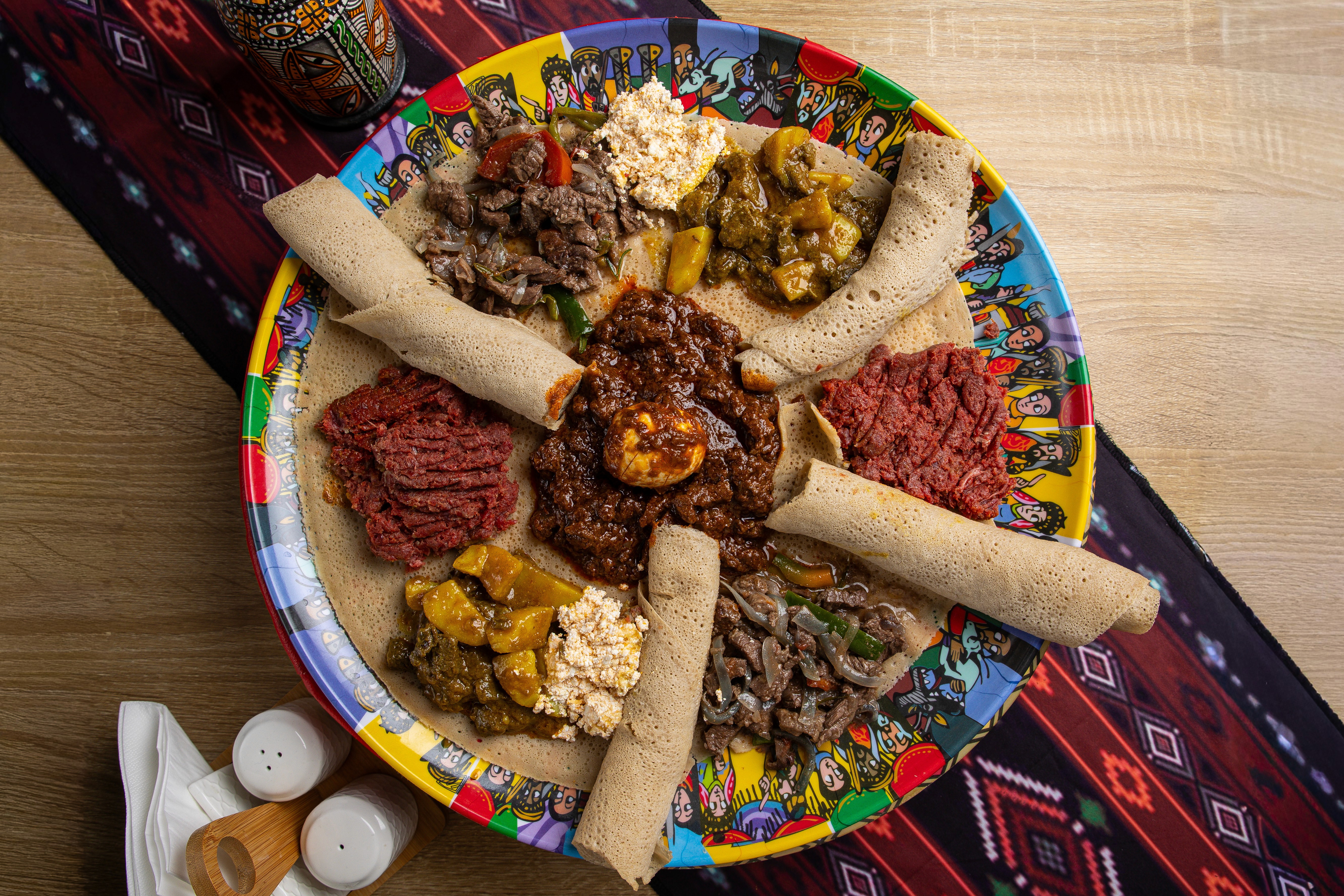 Zestaw sześciu klasycznych etiopskich specjałów mięsnych: Key Siga Wot, Kitfo, Tibs, Alcha Siga Be Dinch, Etiopski Domowy Twaróg oraz Doro Tibs. Podawane z tradycyjnym deserem halawa.