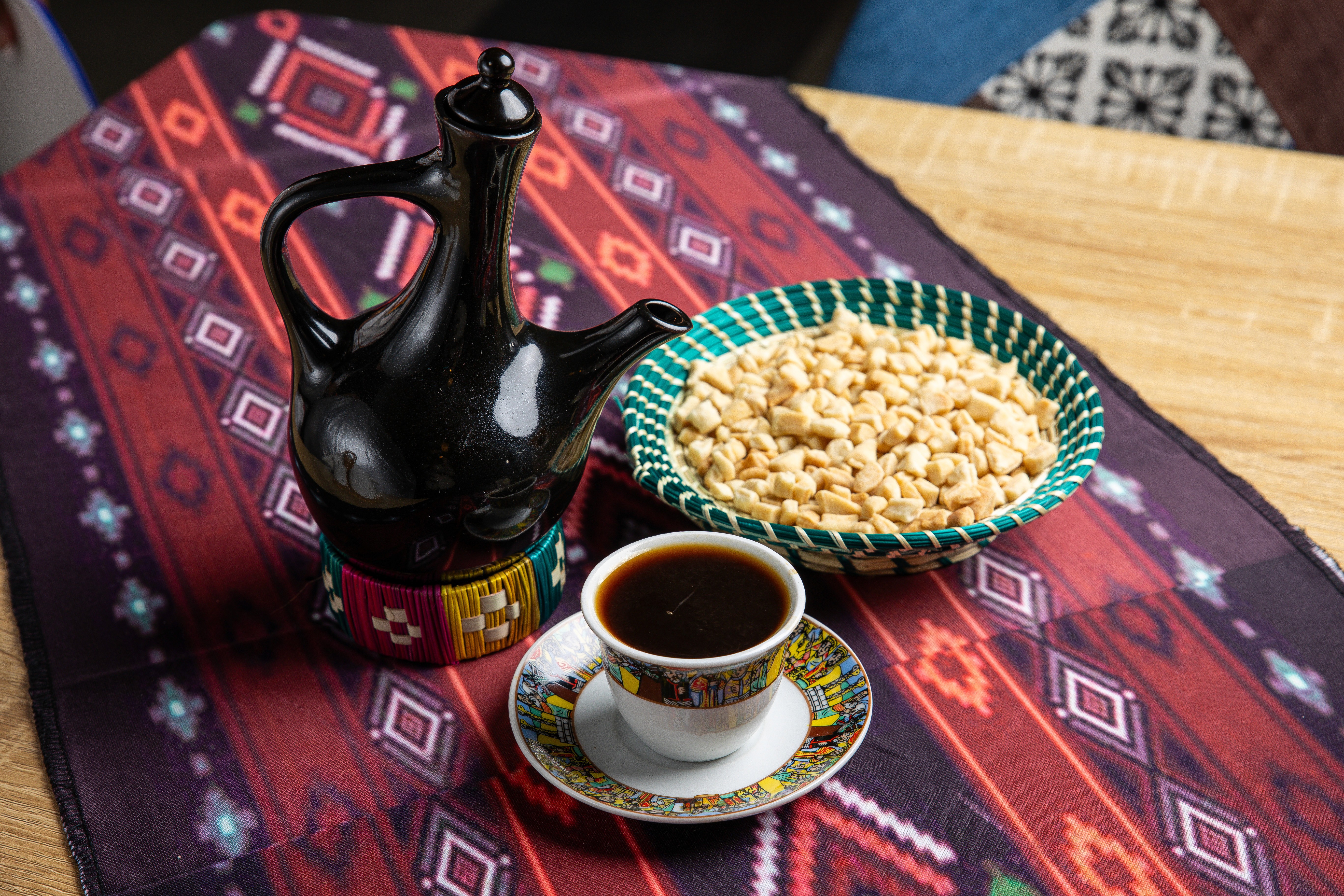 radycyjna etiopska kawa parzona w glinianym dzbanie (jebena) z ziaren wysokogórskich. Podawana z dabo kolo, kromką ambasha i aromatycznym dymem z trawy chis. Rytuał do wspólnego celebrowania.