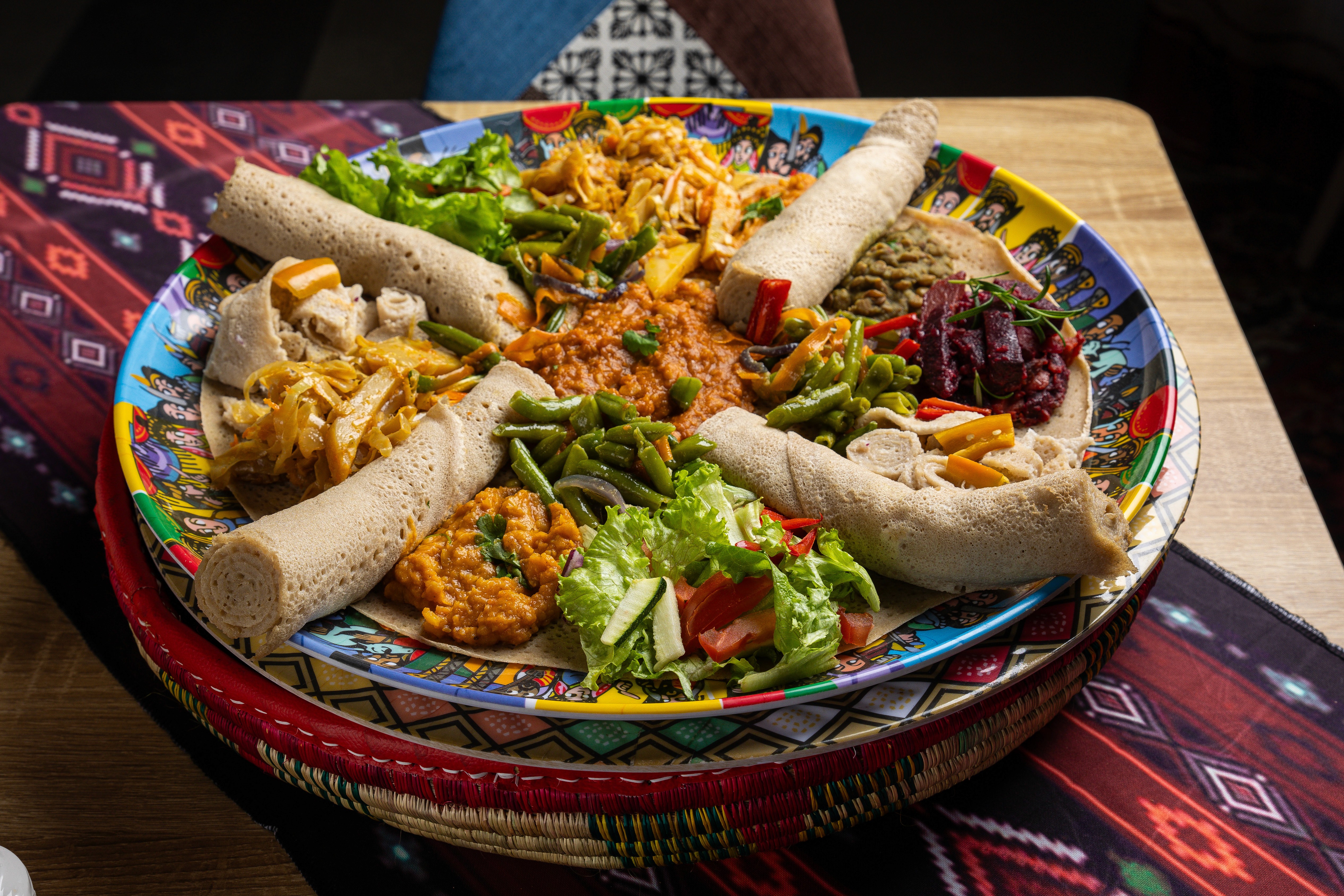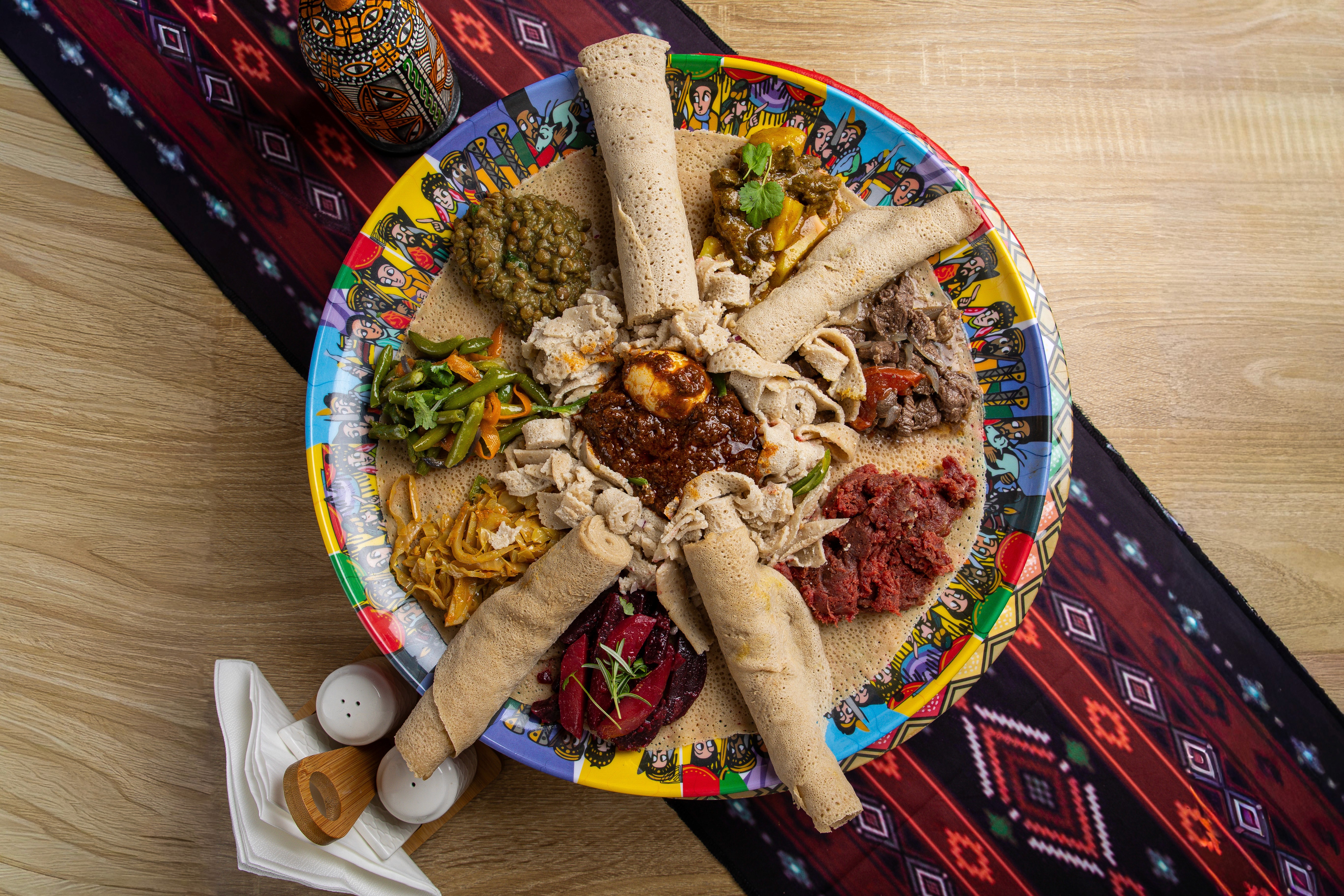 Zestaw łączący siedem dań mięsnych i wegańskich: Key Siga Wot, Tibs, Key Dinch Wot, Alcha Siga Be Dinch, Keysir, Key Kik Wot oraz Etiopski Domowy Twaróg. Podawane z tradycyjnym deserem halawa.