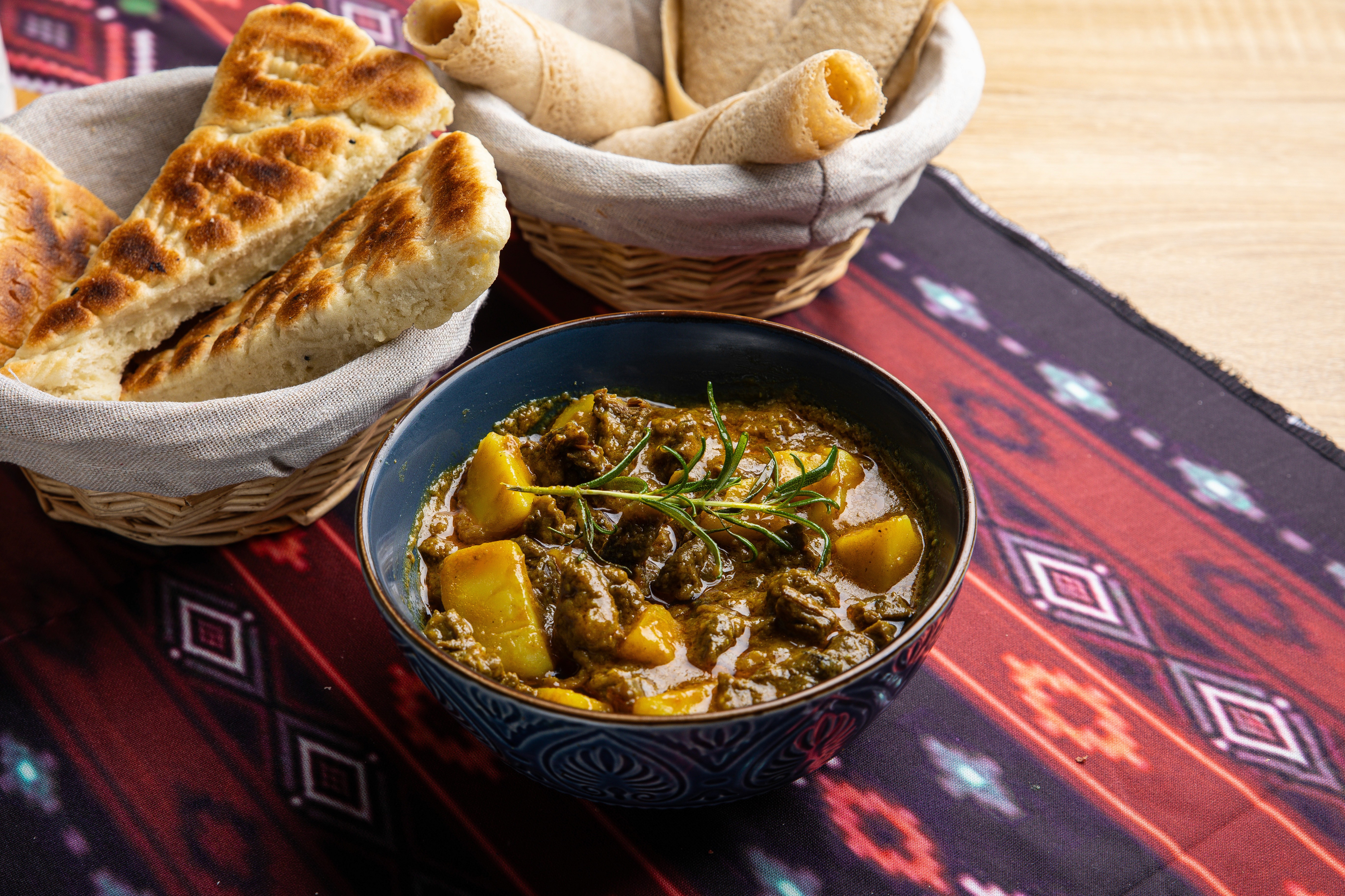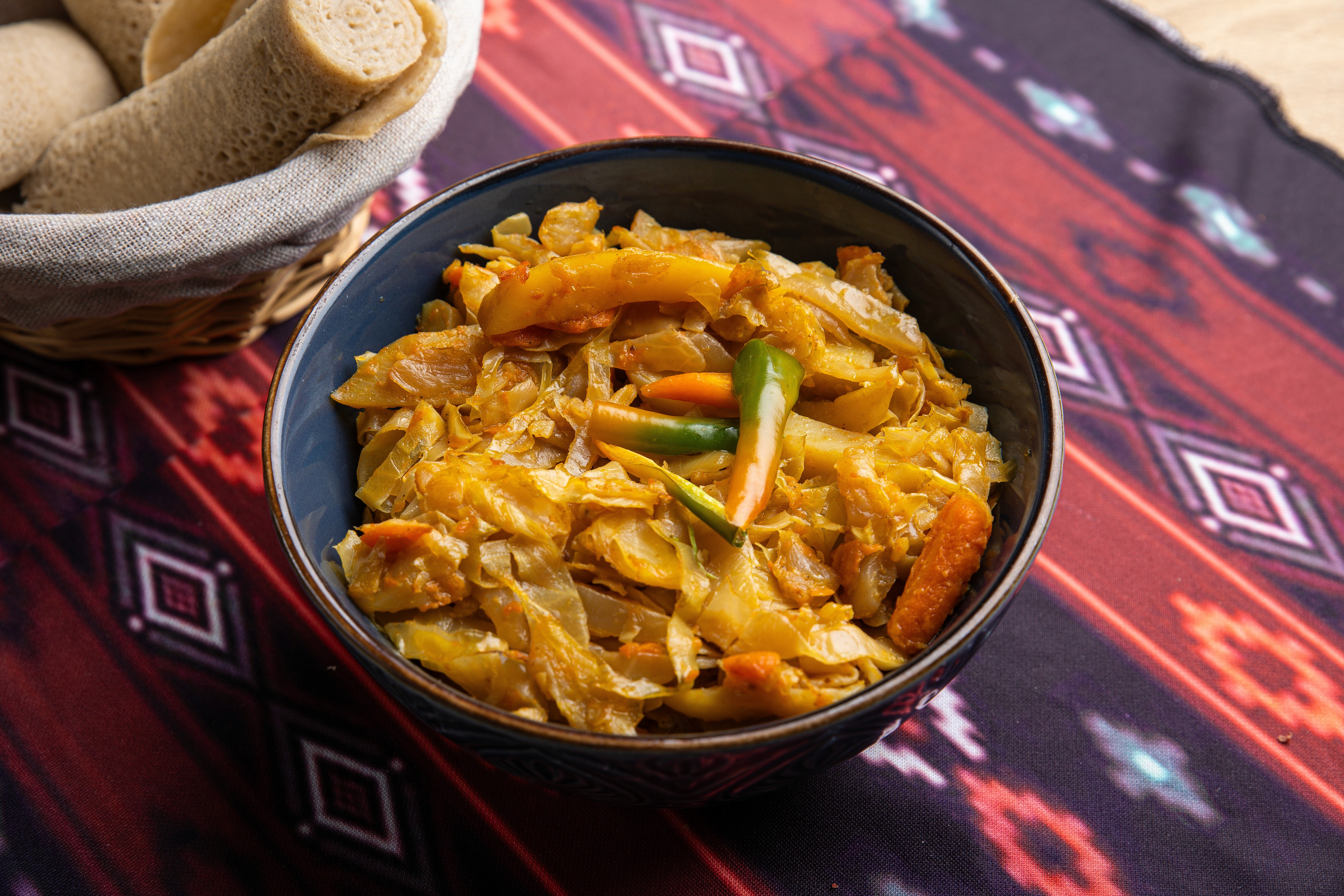 Kapusta i ziemniaki duszone z cebulą, czosnkiem i etiopskimi przyprawami. Smak warzywny, delikatny.