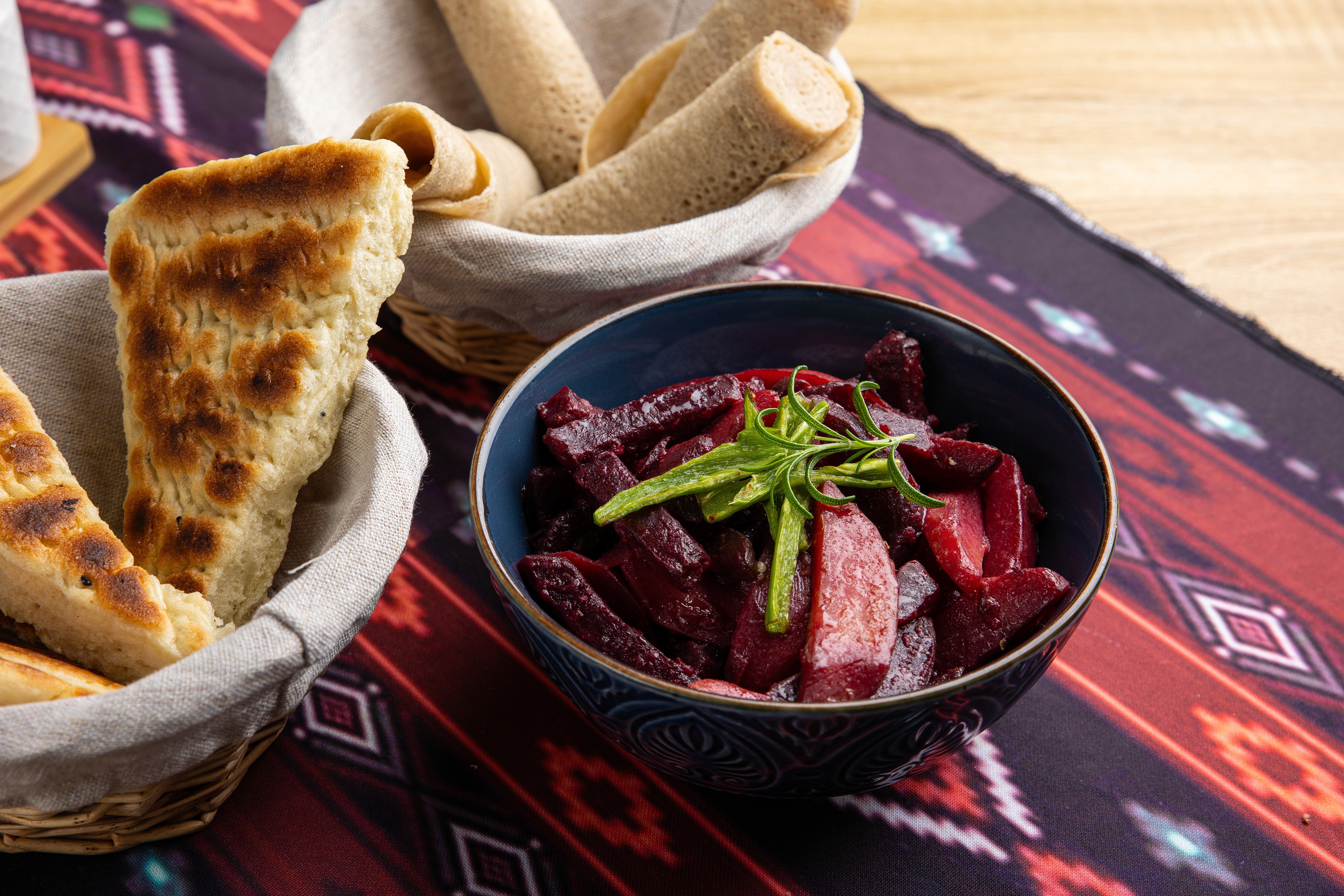 Buraki i ziemniaki duszone z cebulą, czosnkiem i łagodnym berbere. Ziemisty, lekko słodkawy smak. Podawane z: Key Misr Wot i gulaszem z żółtego grochu (Alicha Kik).